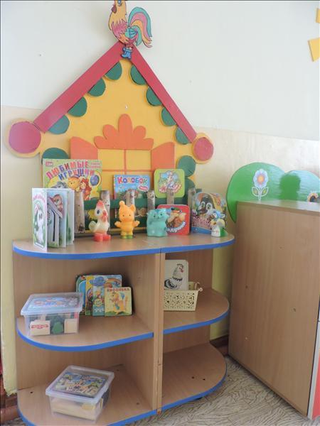 Витринна для книг; картотека сюжетных картинок; детская художественная литература, соответствующая возрасту; иллюстрации к знакомым сказкам и потешкам, игрушки - сказочные персонажи; настольные деревянные театры по сказкам; маски для игр.