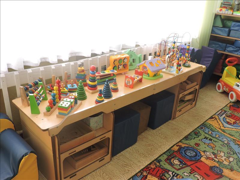 Стол дидактический с наполнением; сортёры разных форм и размеров; пирамидки разноцветные и одноцветные; деревянные счёты; блоки Дьенеша; различные виды шнуровок; различные развивающие деревянные пособия Монтессори; вкладыши разных форм; логические пирамидки; крупные пазлы, состоящие из двух-трёх частей; лабиринты для развития моторики