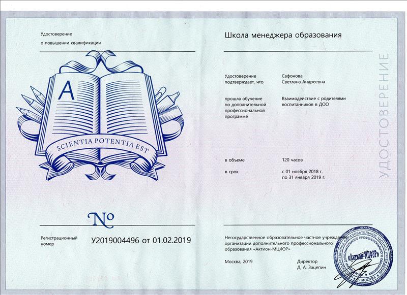 | Негосударственное образовательное частное учреждение организации дополнительного профессионального образования "Актион-МЦФЭР" | Взаимодействие с родителями воспитанников в ДОО | 120 | дистанционная | 01.11.2018 | 31.01.2019 | Файл |