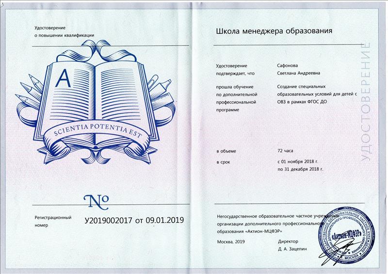 | Негосударственное образовательное частное учреждение организации дополнительного профессионального образования "Актион-МЦФЭР" | Создание специальных образовательных условий для детей с ОВЗ в рамках ФГОС ДО | 72 | дистанционная | 01.11.2018 | 31.12.2018 | Файл |