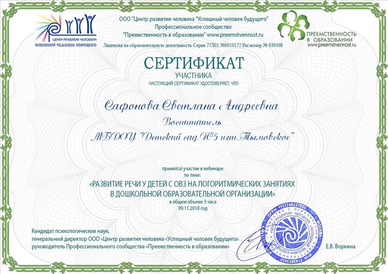 | ООО "Центр развития человека "Успешный человек будущего" профессиональное сообщество "Преемственность в образовании" | "Развитие речи у детей с ОВЗ на логоритмических занятиях в дошкольной образовательной организации" | 3 | Вебинар | 09.11.2018 | 09.11.2018 | Файл |